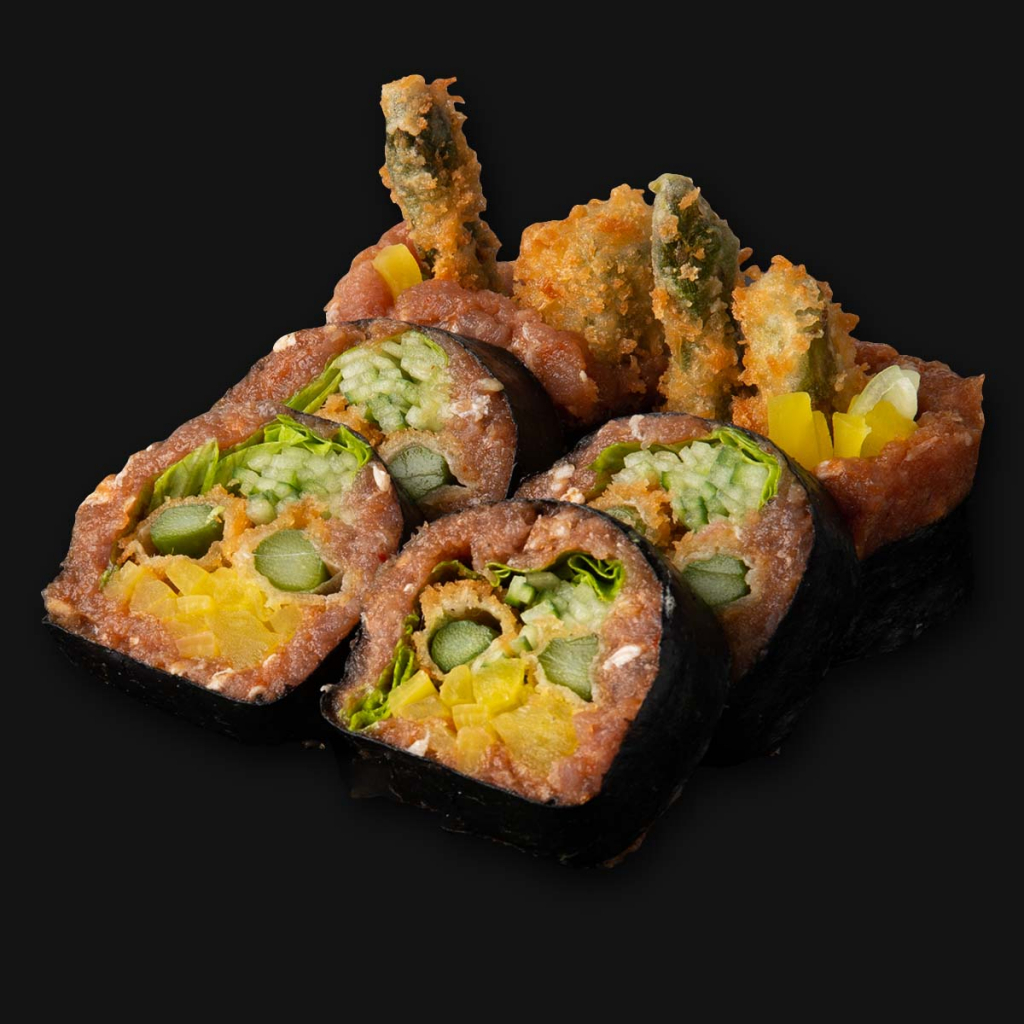 tatar z tuńczyka zamiast ryżu, ogórek, oshinko, szparag w tempurze