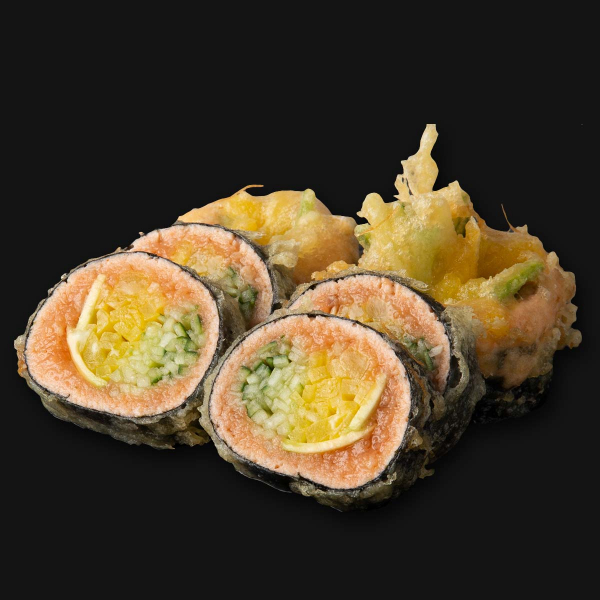 tatar z łososia zamiast ryżu, ogórek, awokado, oshinko w całości w tempurze