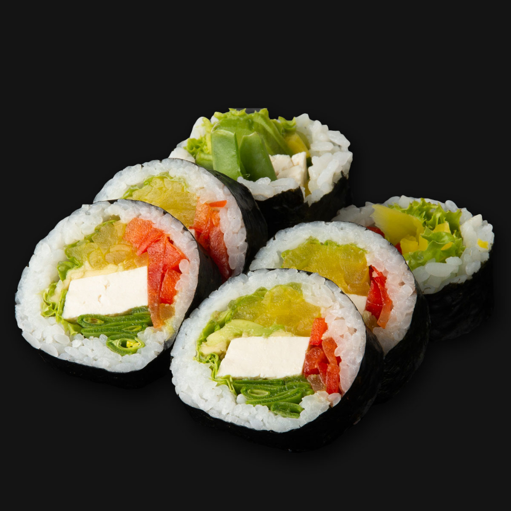 Tofu w panko, groszek cukrowy, sałata, oshinko, papryka czerwona,awokado, chilli mayo